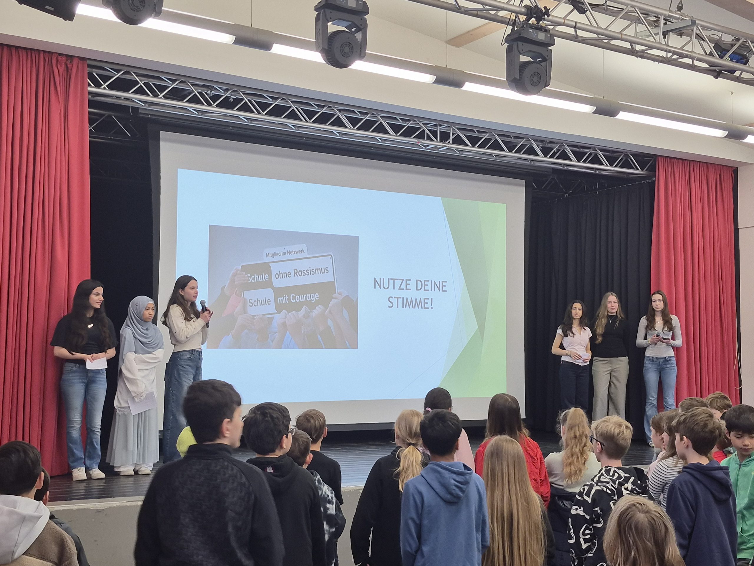 Am Donnerstag fand der Europatag 2026 am IKG statt. Am Morgen fand in der Aula zunächst eine besondere Präsentation des 10 Jahrgangs statt. Shazia A., Elanur B., Gabriele A., Angelina K., Lamar M. und Emma J. moderierten sehr überzeugend die Veranstaltung und informierten alle Jahrgänge mit einer anschaulich gestalteten Präsentation über eine bevorstehende Abstimmung, die Ende Mai an unserer Schule stattfindet. Mit dieser Abstimmung wird entschieden, ob wir als Schule am Projekt „Schule ohne Rassismus – Schule mit Courage“ teilnehmen und Teil des bundesweiten Netzwerks von Schulen werden, die an diesen wichtigen Projekten mitwirken. Unsere Schülerinnen und Schülern erhielten so einen Einblick in die Bedeutung der Teilnahme an diesem Projekt. Um teilzunehmen, muss jedes Mitglied unserer Schule – von den Schülerinnen und Schülern über den Hausmeister bis zum Schulleiter – darüber abstimmen.