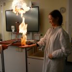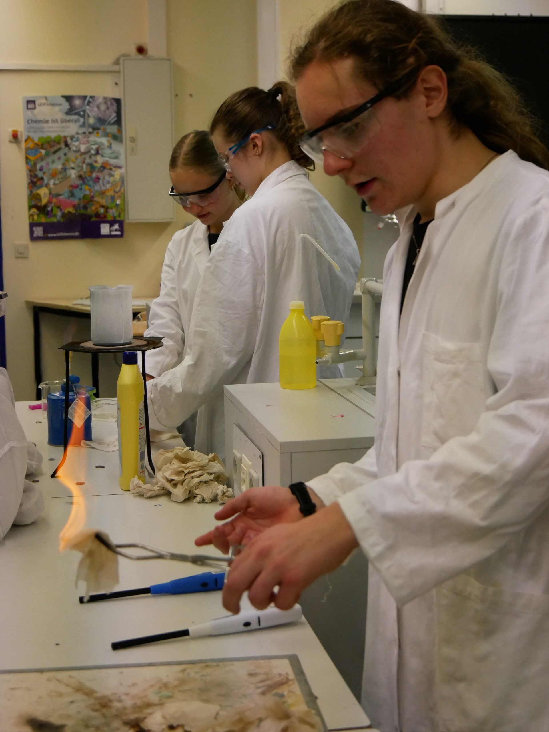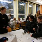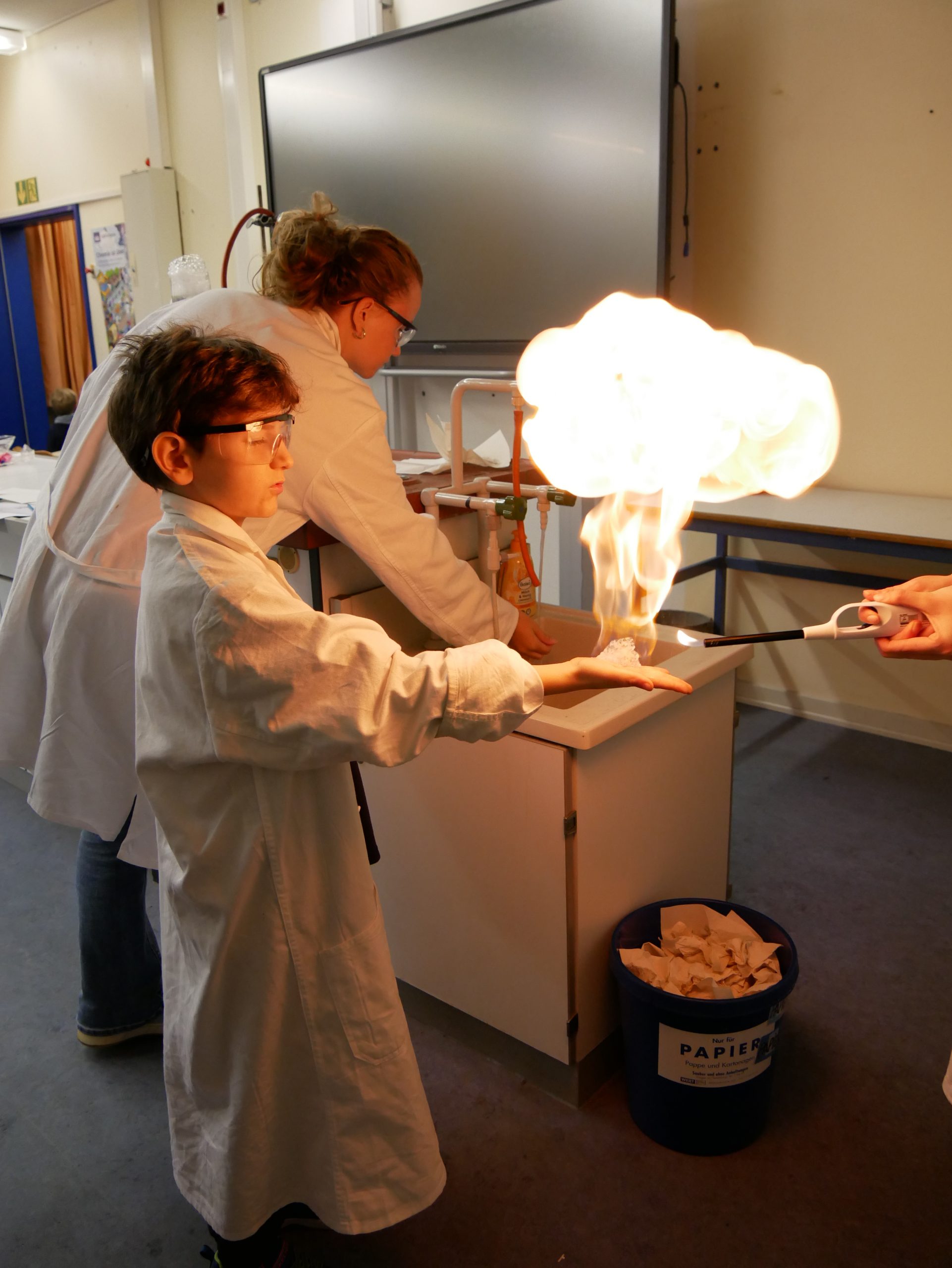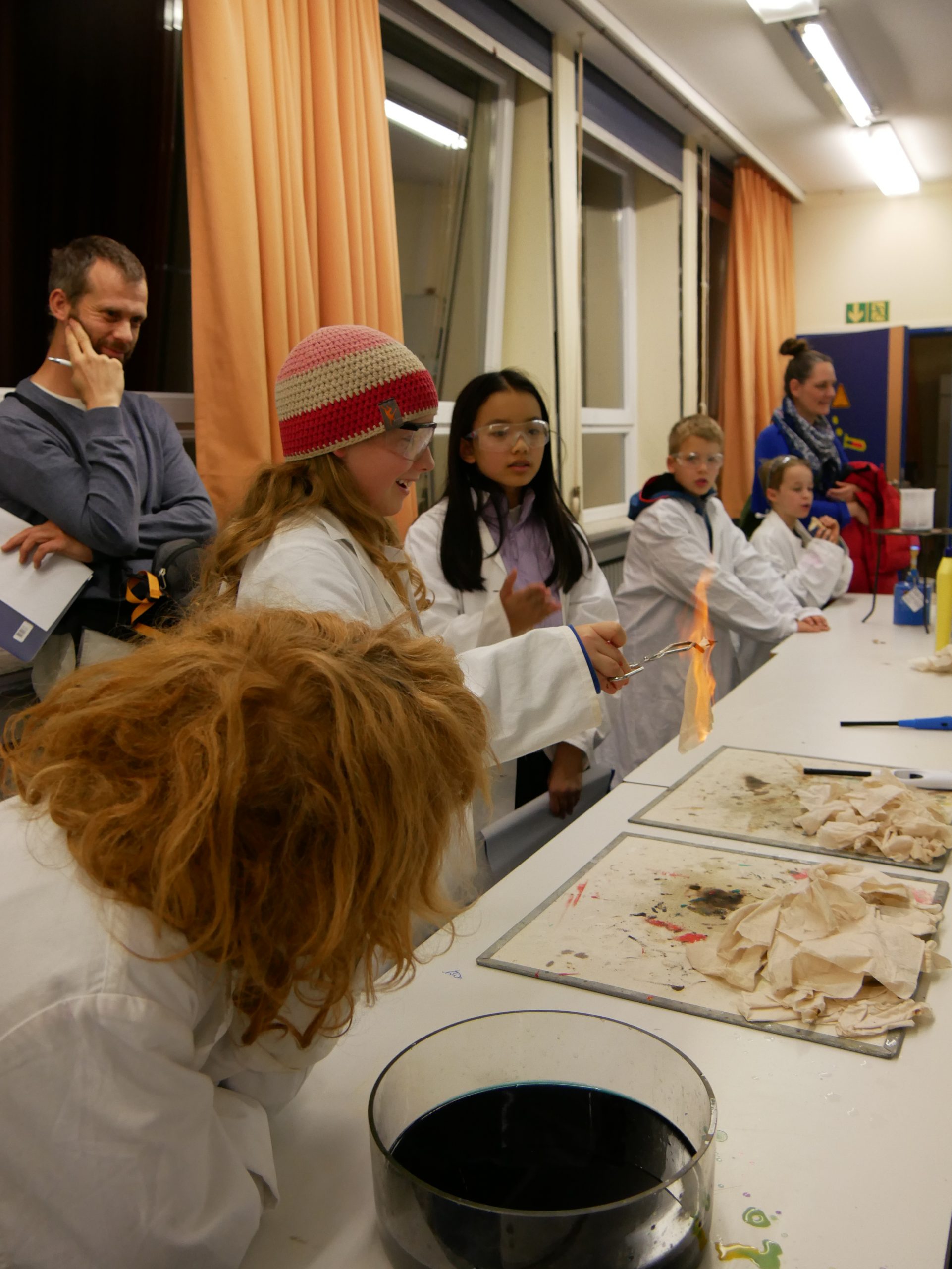 In der Chemie ging es heiß her. Mutige Freiwillige konnten unter wachsamen Augen eine Flamme wahrlich in der Hand halten. Ein weiteres Highlight war das ‚brennende Papier‘, das dank einer Mischung aus Wasser und Ethanol von einer Flamme eingefasst war, ohne tatsächlich zu verbrennen. Auch auf die Frage, warum Rotkohl auch Blaukraut genannt wird, wurde eine Antwort gefunden.