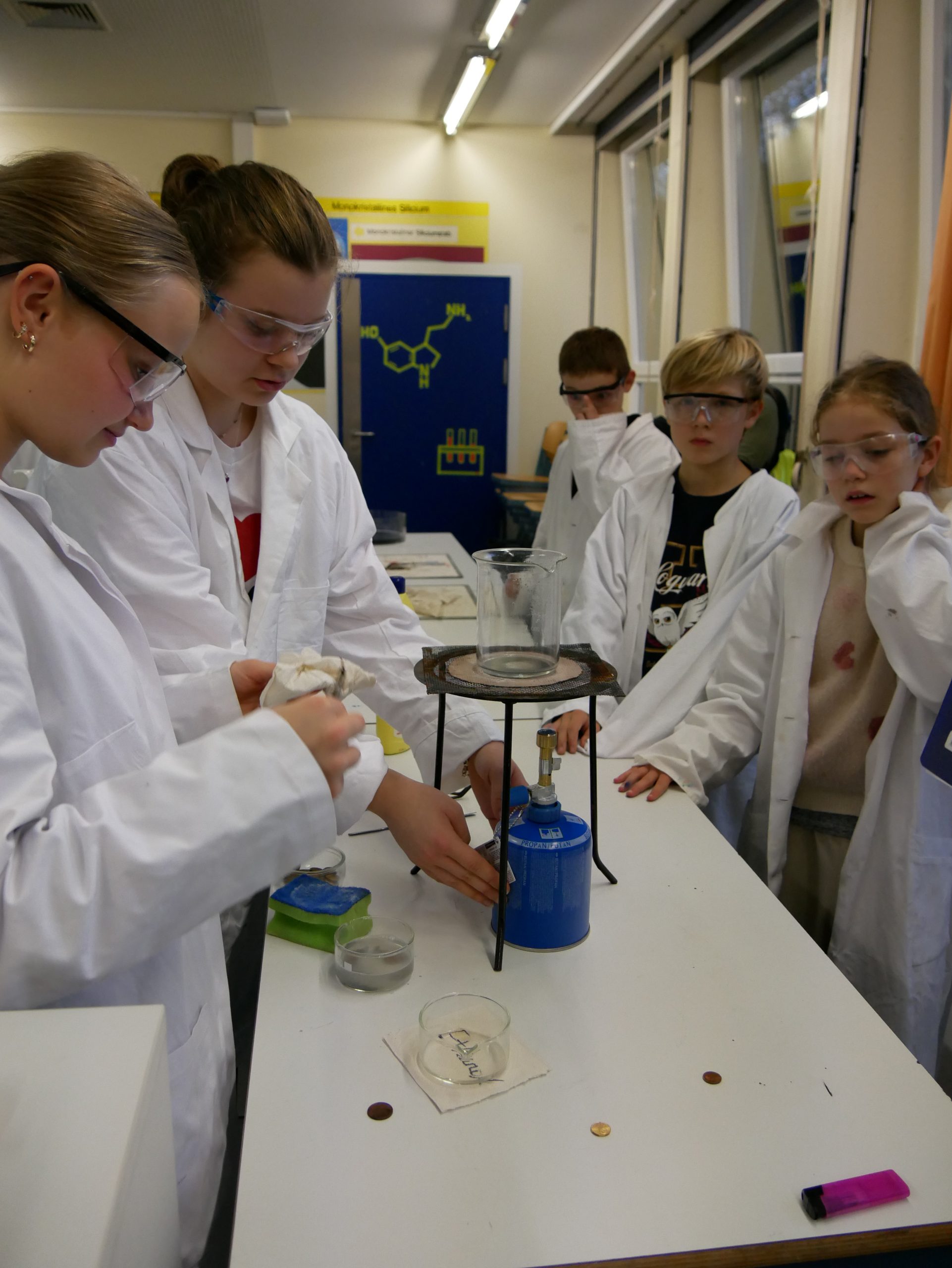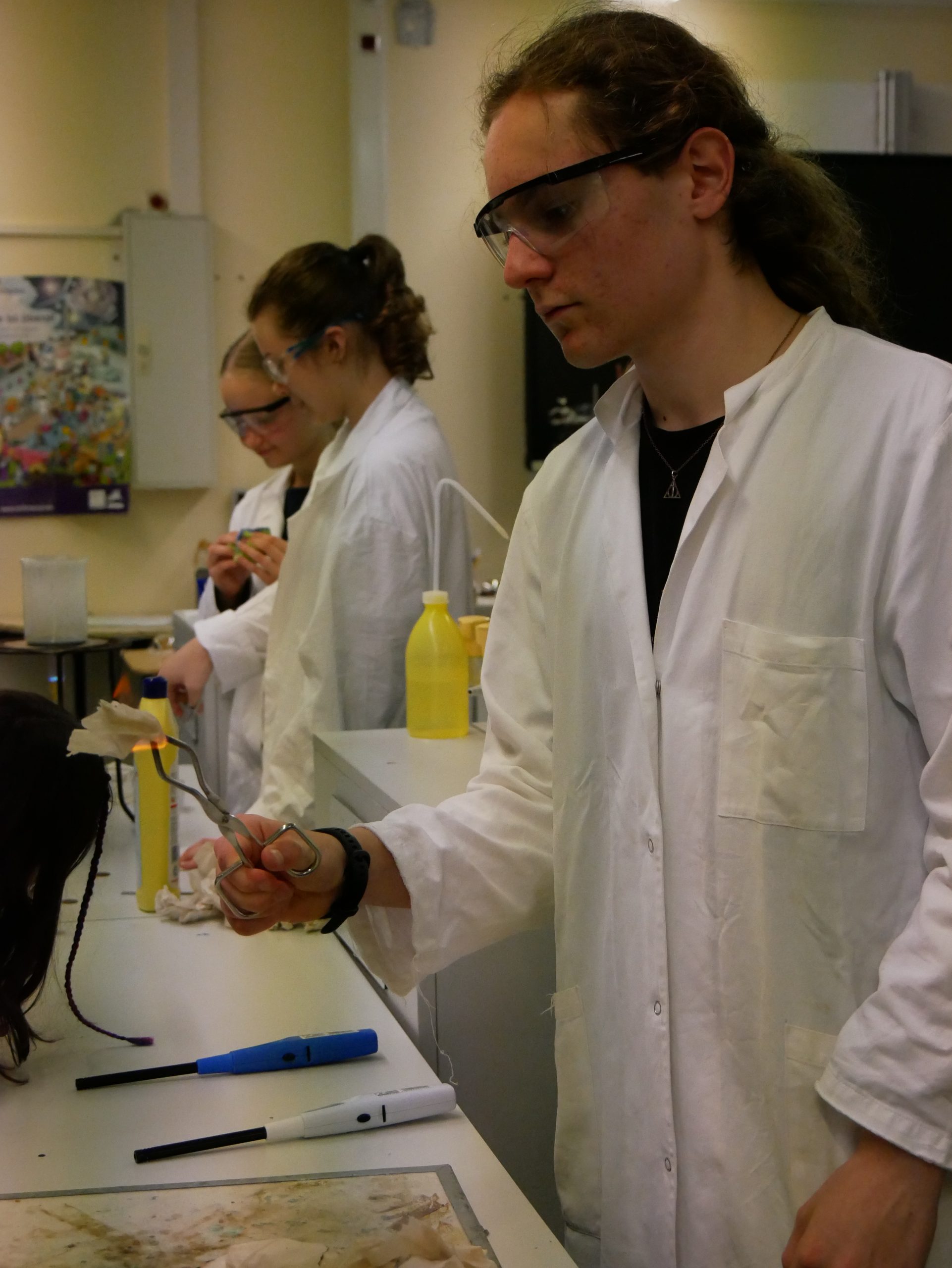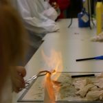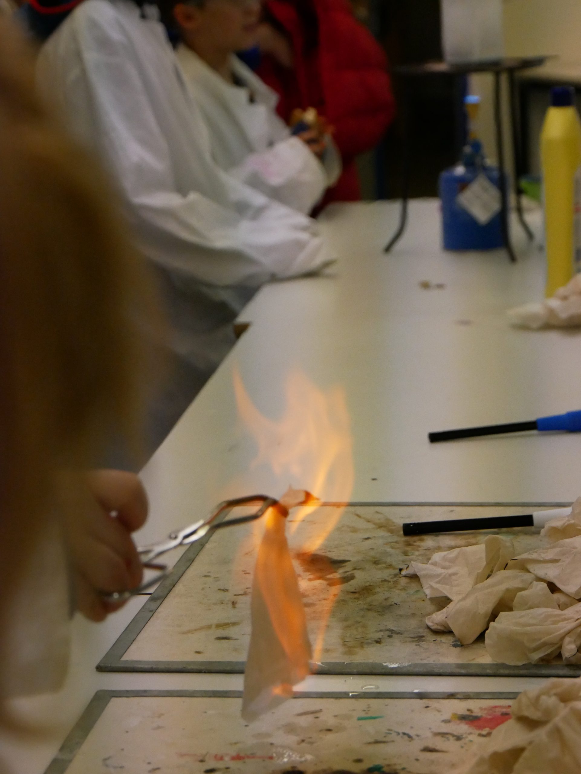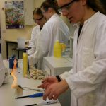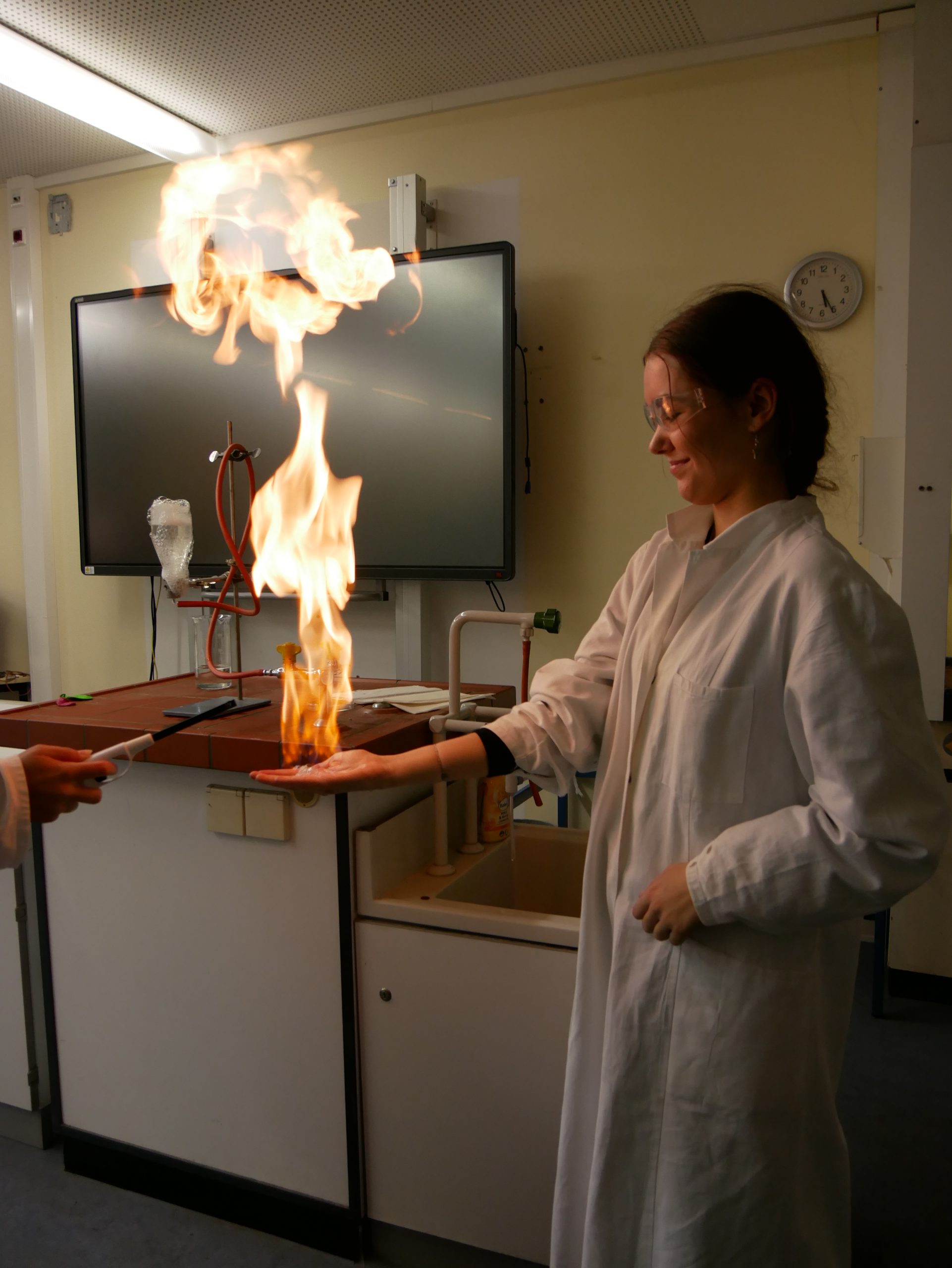 In der Chemie ging es heiß her. Mutige Freiwillige konnten unter wachsamen Augen eine Flamme wahrlich in der Hand halten. Ein weiteres Highlight war das ‚brennende Papier‘, das dank einer Mischung aus Wasser und Ethanol von einer Flamme eingefasst war, ohne tatsächlich zu verbrennen. Auch auf die Frage, warum Rotkohl auch Blaukraut genannt wird, wurde eine Antwort gefunden.