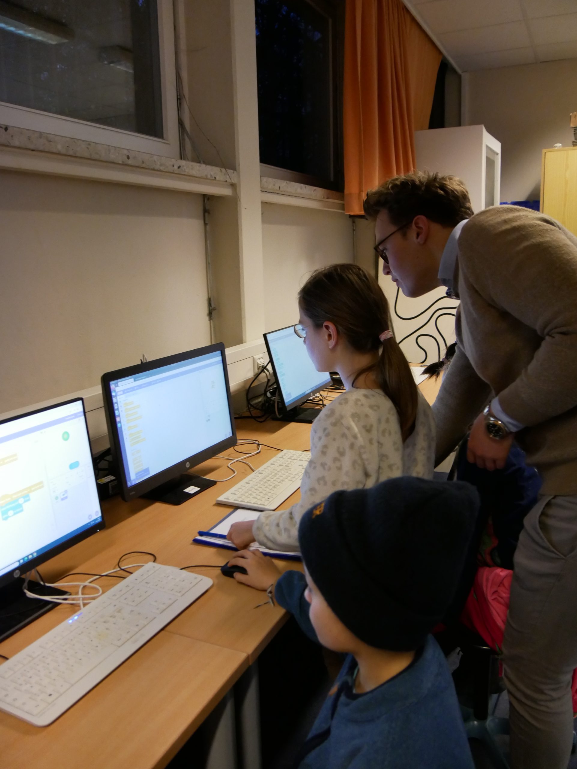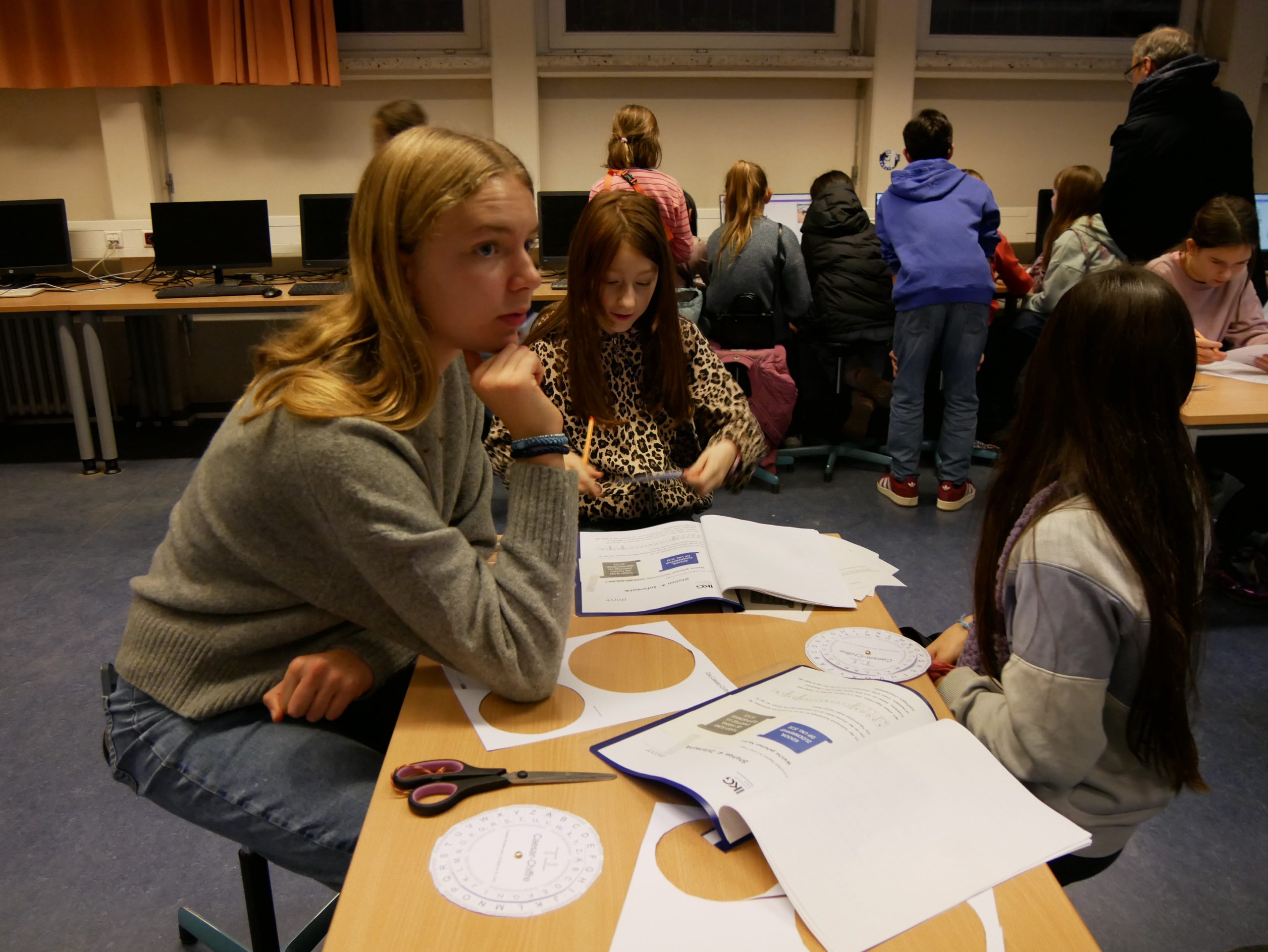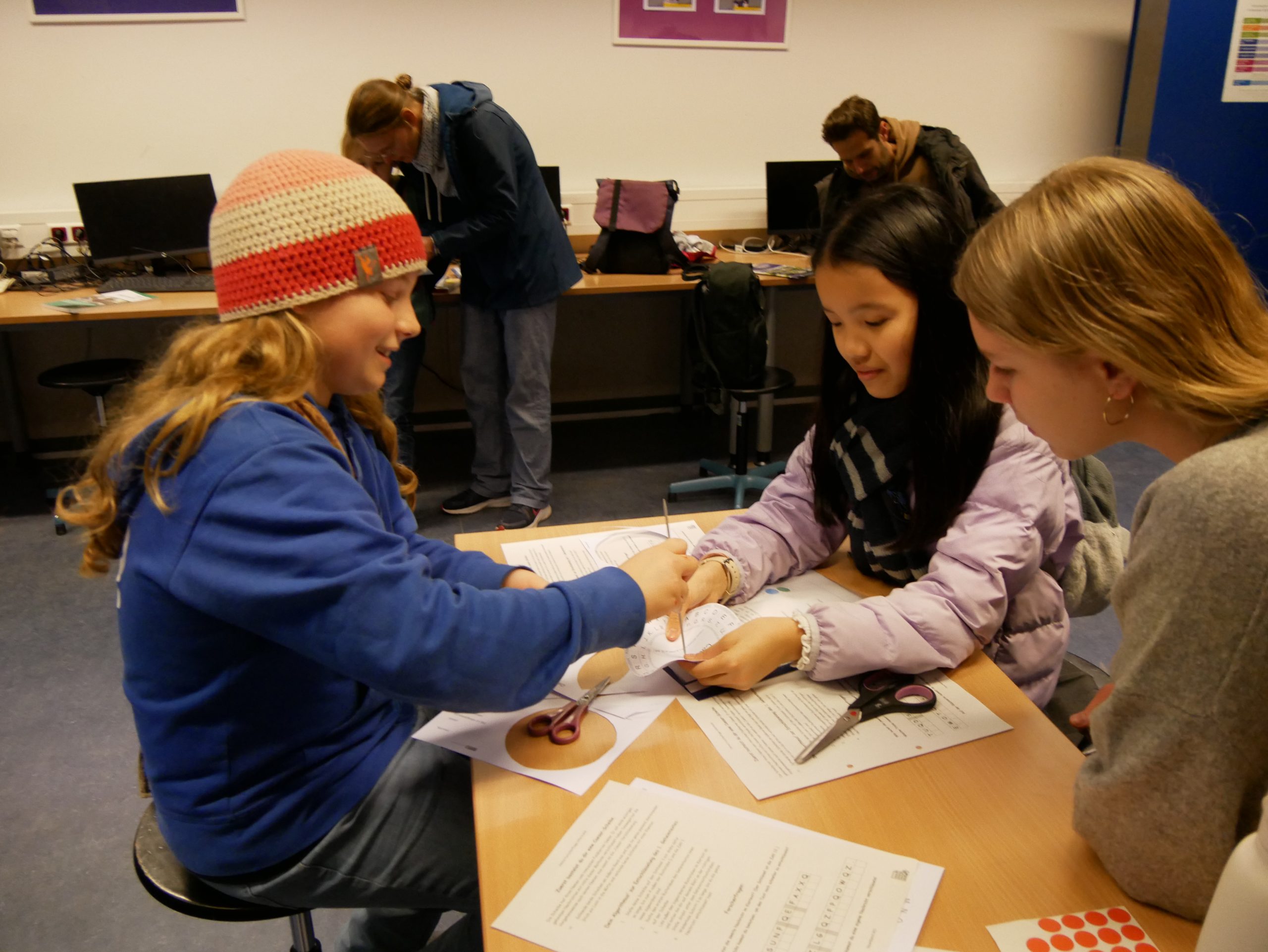 Auch die Informatik kam nicht zu kurz. Verschlüsselungen wurden geknackt und eigene Codes entwickelt. Auf den Spuren der Anfänge der Informatik konnten sich die Kinder z. B. an einer Variante des ersten Computerspiels ausprobieren. Hier wurde wieder deutlich, dass Informatik doch mehr als Einsen und Nullen ist, sie bedeutet auch eine ganze Menge Spaß!